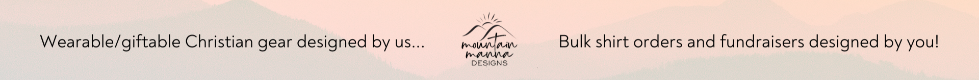 We are a Christian homeschool family in the woods of West Virginia. We started Mountain Manna in 2023 to help pay for special therapies needed by our kids - and have been so blessed by how God has grown this business! Our main line of work is our bulk division for schools, churches, clubs, mission organizations, non-profits, etc to be able to order logo gear or custom designs. We also love helping good causes raise money, so be sure to contact us about your fundraising needs!